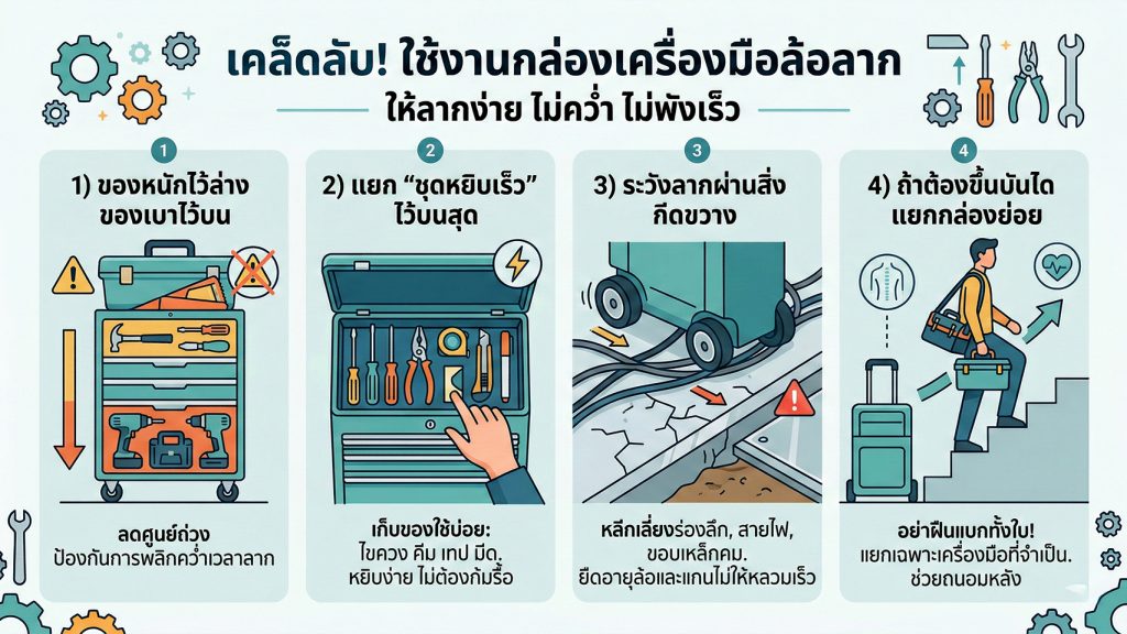 กล่องเครื่องมือช่าง ล้อลาก ส่วนใหญ่หนักอยู่แล้ว พอใส่เครื่องมือเข้าไปยิ่งหนัก ถ้าต้องแบกขึ้นบันไดทีละชั้น คุณจะกลับไปคิดถึงกระเป๋าสะพายทันที ทางแก้ไม่ใช่เลิกใช้ แต่คือ “แยกระบบ”